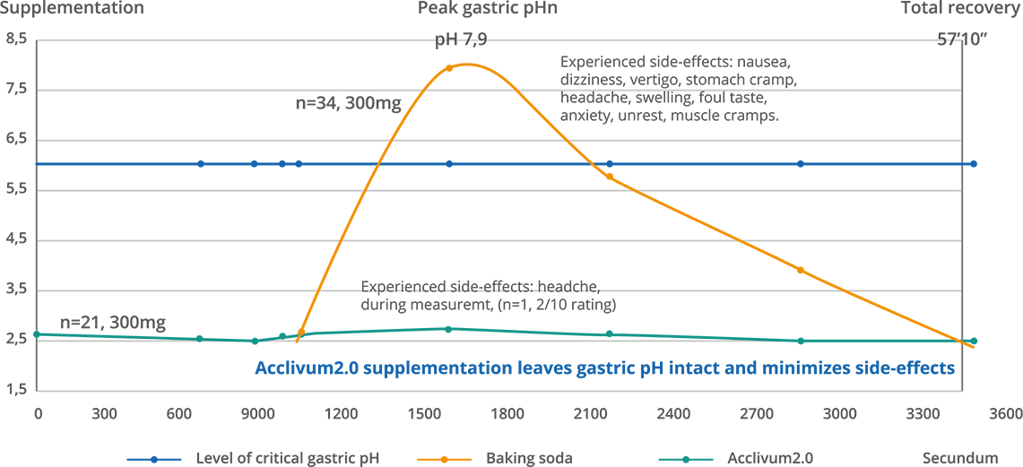 The efficacy of Acclivum2.0 supplementation has been demonstrated by Semmelweis University’s study (n=32) examining the effects of bicarbonate-containing capsules on intraluminal (stomach and small intestine) pH. The Acclivum2.0 filled capsules are successfully bypassing the acid stomach and quickly releasing all of its active-agents within a few seconds in the upper part of the duodenum, without being forwarded by peristole. Furthermore, Acclivum2.0 proved to be safe, only a few participants experinced mild and transient side-effects.